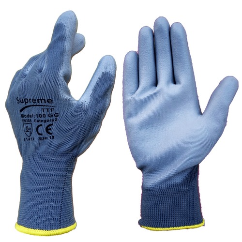 100 GG is a five-finger Grey Nylon or Polyester knitted liner glove with a Gret Polyurethane coating on the palm and on the finger tips. The back of the glove remains uncoated providing good ventilation to the hand thus avoiding perspiration and clamminess. This glove fits like a second skin, molding to the operators hand and is very popular in the automobile industry and is also used for delicate engineering operations.