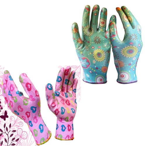 These gloves are 13 gauge flower patterned Polyester lined gloves with nitrile coating at the palm for easy grip.